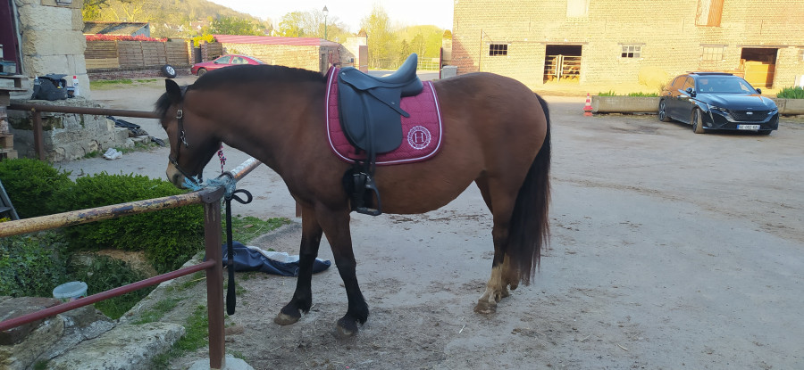 Édit : voici la selle en fin de séance et je 'n'avais pas sanglé comme une folle. Elle est juste derrière l'épaule; on pourrait croire trop en avant mais non ; je pourrais pas faire mieux sur ponette. En tout cas elle était à l'aise et moi aussi. Un bon point. Je pense que ce sera encore mieux avec la mattes. Je me pose la question de l'arcade aussi mais plus large ça va trop descendre sur le garrot et plus étroit j'ai un gros doute. On va dire que je peux passer la main le long des matellassures ; c est juste un peu plus "serré" au niveau du garrot mais ça ne comprime pas mais c'est pas lâche non plus ; c est au contact.