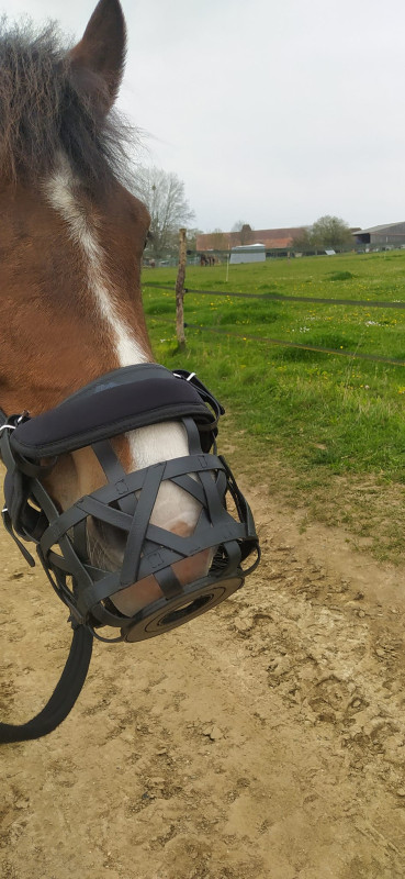 Malgré le caractère de ponette elle l'a très bien accepté. En deux minutes elle broutait sans signe de frustration et 2h après elle était au râtelier en train de manger du foin. A voir dans le temps mais je suis contente.