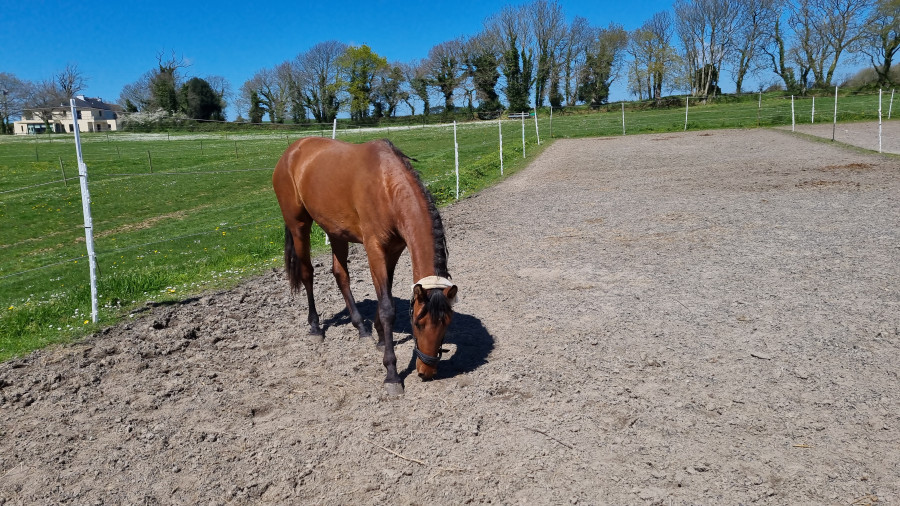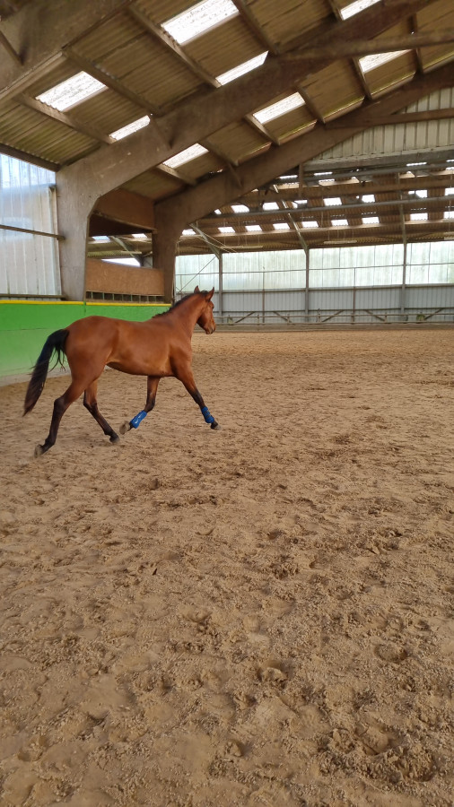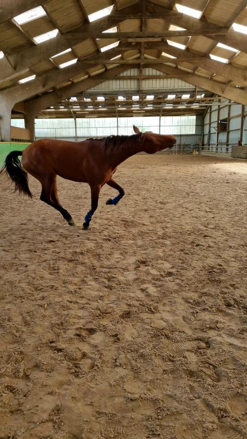 Par contre sortie, il reste tendu et force un peut, mais à l'écoute un minimum, première longe samedi, un vrai petit démon volant, et aujourd'hui, très bien à part un petit départ à fond de caisse, paddock tous les jours.