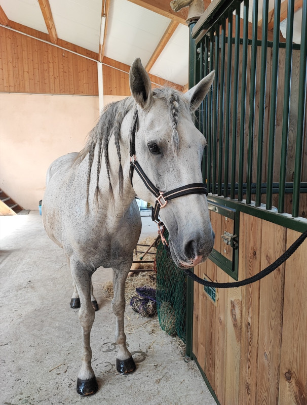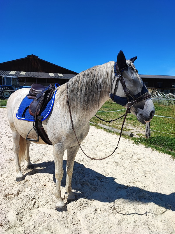 J'ai acheté un bridon de dressage cuir rond comme je voulais depuis longtemps pour ma DP (et ma pouliche plus tard), craquage malgré que le modèle de "rêve" aurait été noir et blanc mais vu le prix en solde je n'ai pas hésité. Le modèle n'existait donc pas en "bordé" de blanc sur la muserolle (pas bradé en tout cas), je voulais savoir si vous savez où trouver un espèce de pad ou autre système pour muserolle pour que le contour ressorte blanc ?
