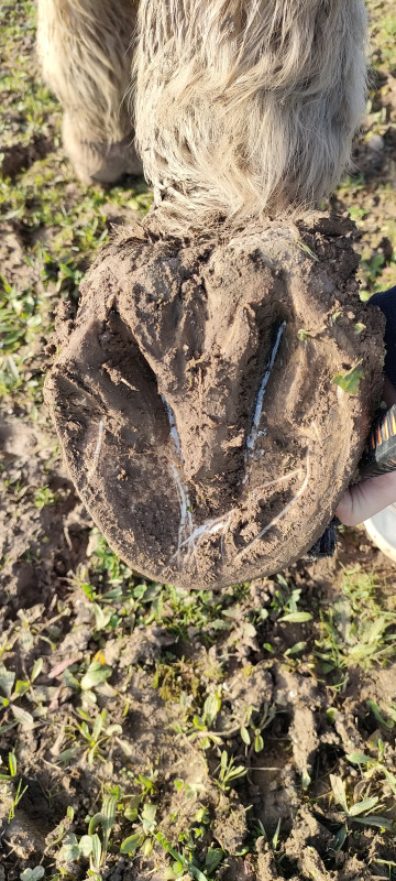 Je suis tellement contente de voir cette fourchette ! On s'est enfin débarrassés de la pourriture profonde de fourchette qui nous poursuivait malgré le deferrage. Il nous a fallu presque 3 ans pour que ça se comble. Maintenant qu'il est a 100% au pré et qu'il peut vraiment marcher, je n'ai plus aucun soins a faire et le problème semble derrière nous. Il a bien du prendre 2 a 3cm de largeur de talons depuis que je le connais !