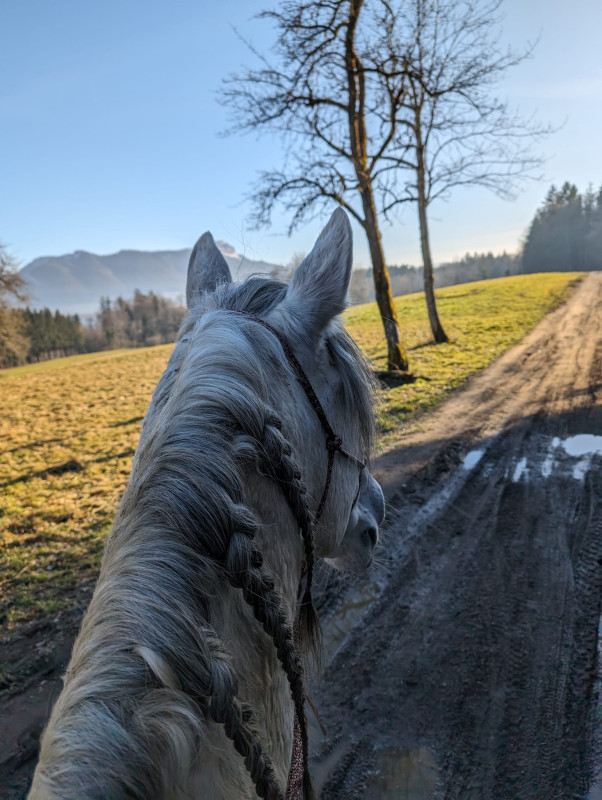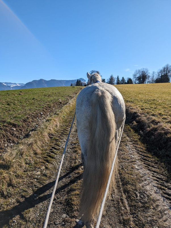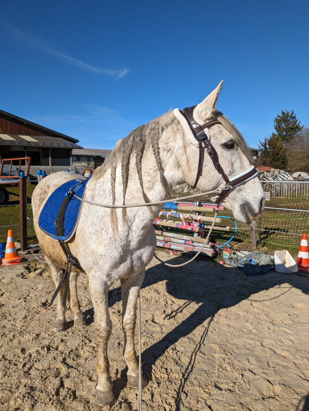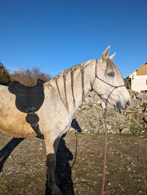 On a fait une mini-séance montée hier qui s'est bien passée. Je vais essayer de le monter un peu plus dans le week-end. Finalement, c'est bien moi la plus stressée des deux. Je sais que Poney peut être compliqué, et je ne maitrise pas l'environnement extérieur donc je n'ose pas trop encore.