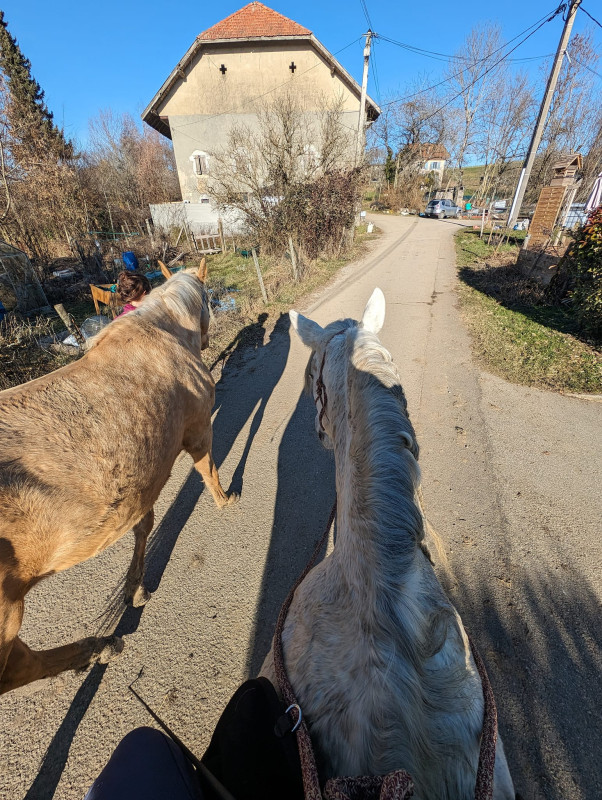 Et aujourd'hui balade au pas à cru en licol avec ma copine et son poulain à pied, Zouzou irréprochable, en forme mais en même temps hyper calme, et hyper mignon avec le copain, ils se sont fait des mimis, marché côte à côte, devant, derrière tout est passé nickel