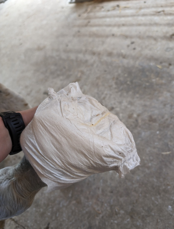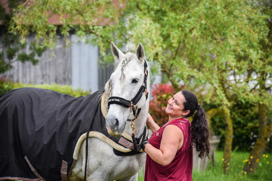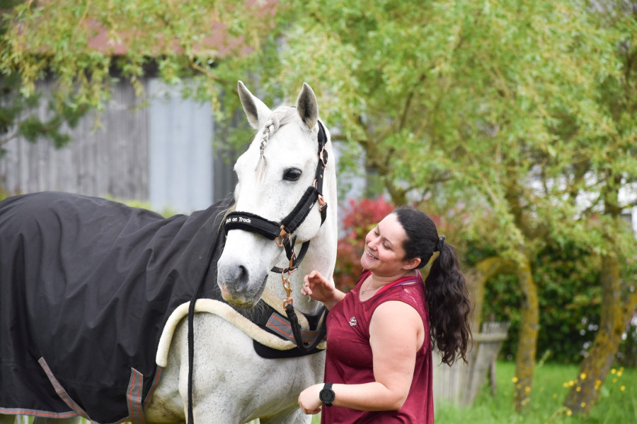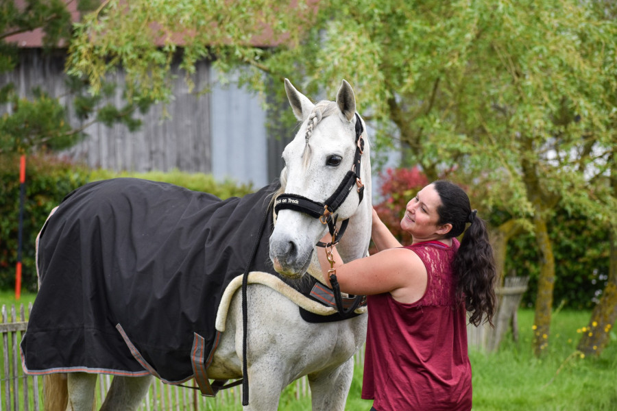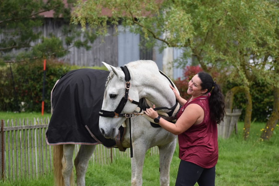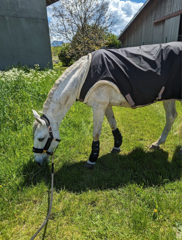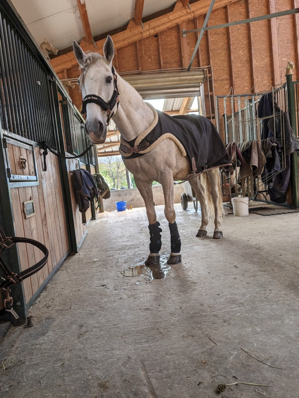 Après 45 minutes de brouting, retour aux écuries, je le masse pendant 20 minutes avec le gant massant puis je fais mon pansement aux graines de lin !