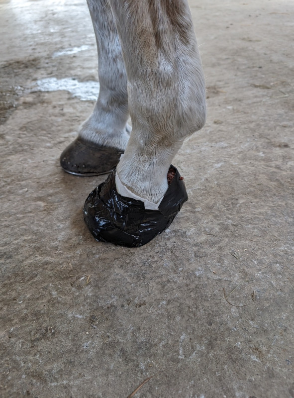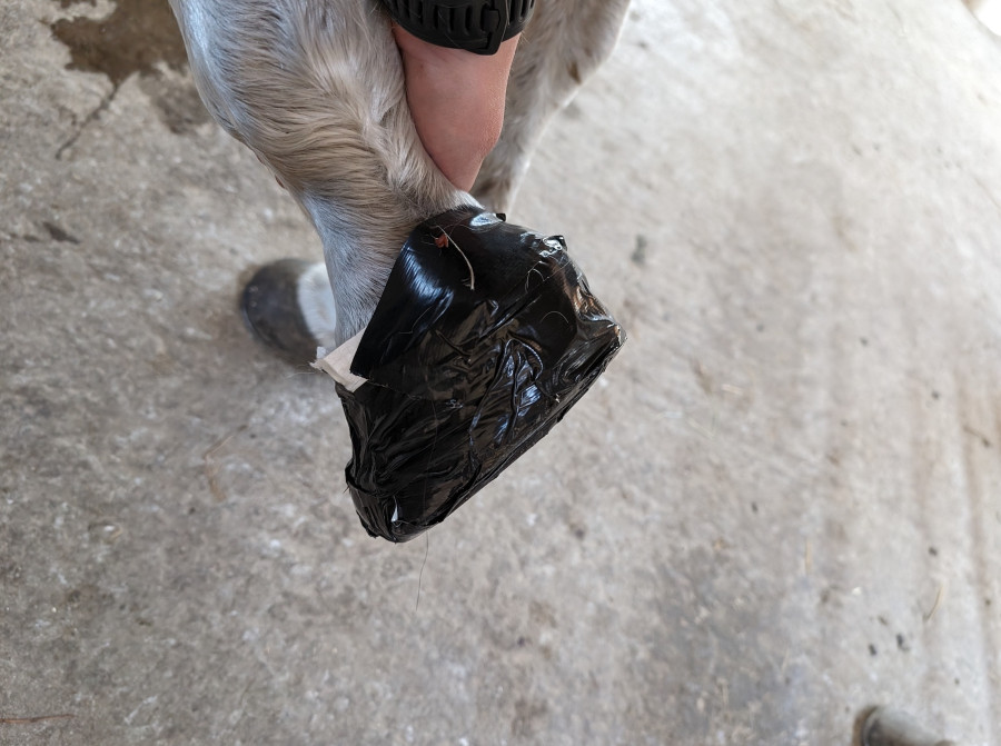 je le fais marcher dans l'écurie avec le pansement pour voir si ça tient, il pose de nouveau pas très bien le pied ...