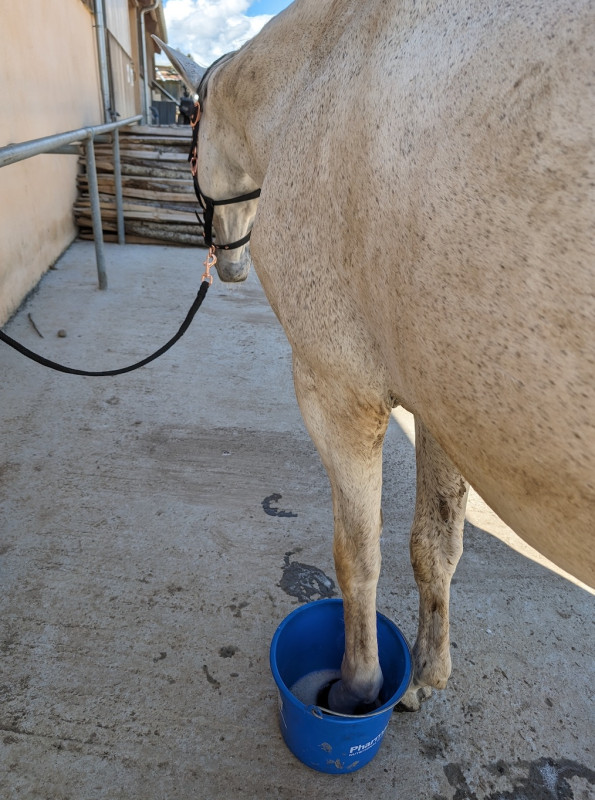 Bref retour sur la dalle de pansage, je fais (non sans mal) bain de pied à l'eau et la betadine puis je l'emmène brouter (j'ai mis les guêtres de froid aussi, on sait jamais ça peut peut être aider)