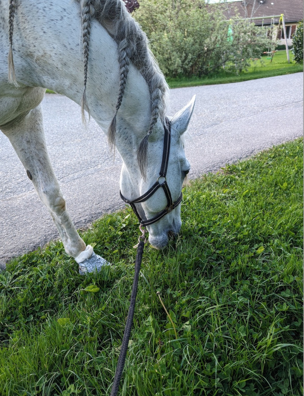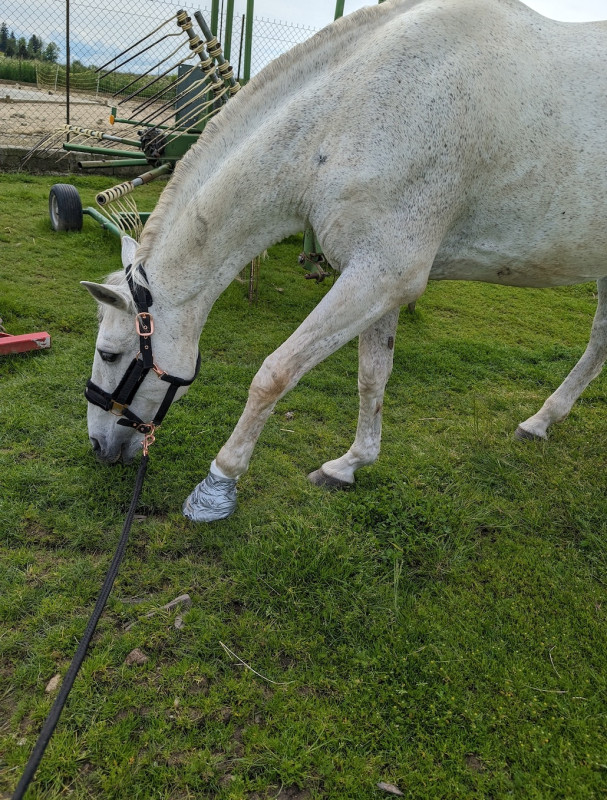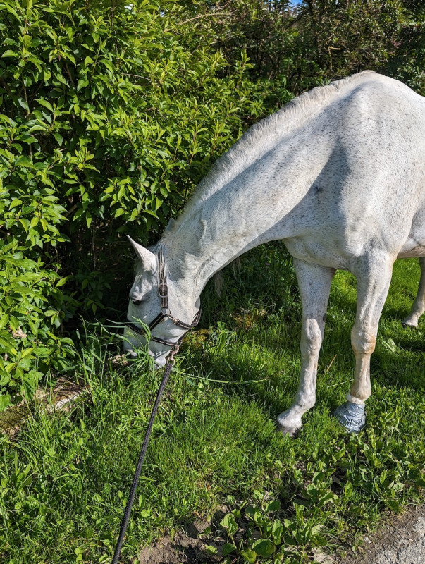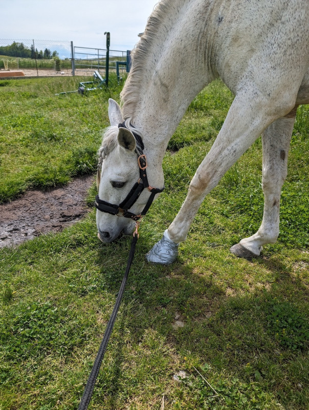 Même scénario, pas boiteux ce matin quand Anne l'a sorti au pré ... J'arrive aux écuries, je passe devant le pré en voiture, hum déjà il broute sans poser le pied ...