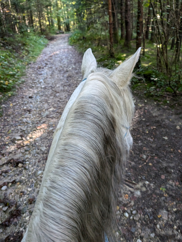 Pour nous ce we c était remise en forme de miss Quiqui a pied.. Je suis contente, elle retrouve de l énergie. Son trot est moins étriqué. Le galop ce sera pour la fois prochaine. Quand à Kinder j ai hésité à le monter pour causé de tempête. La serre des voisins faisait du bruit, à 2 doigts de s envoler. Il est resté zen. Après on est restés au pas et au trot. Bon il y a du boulot rien qu aux petites allures pour bb.