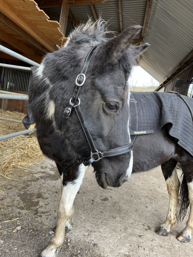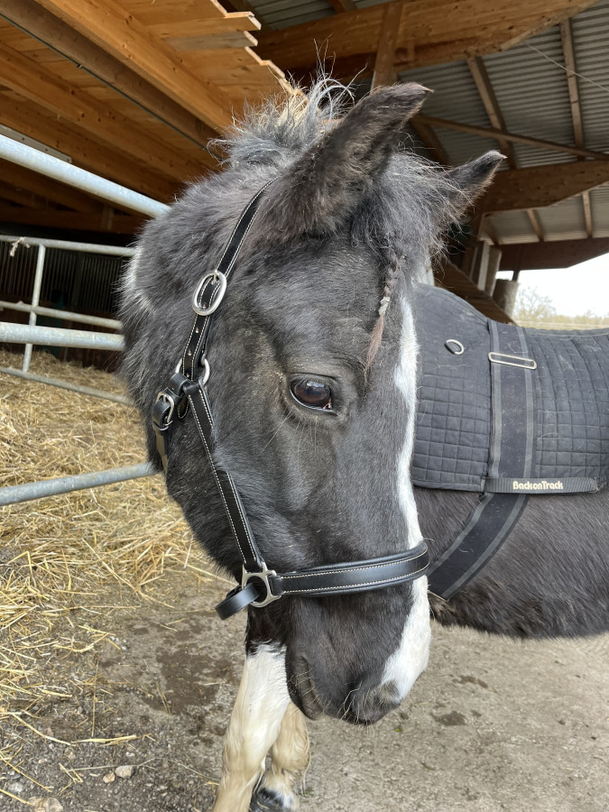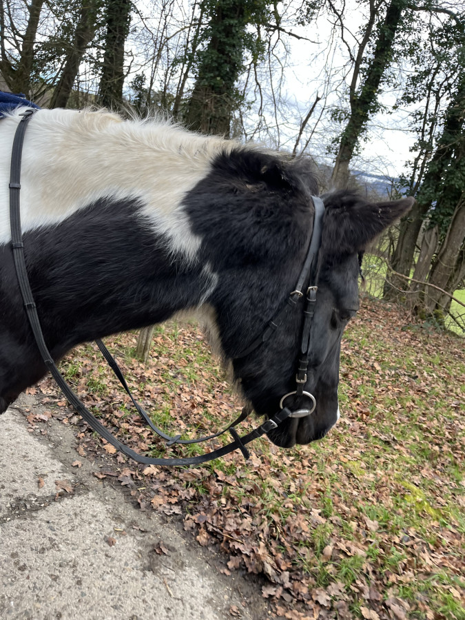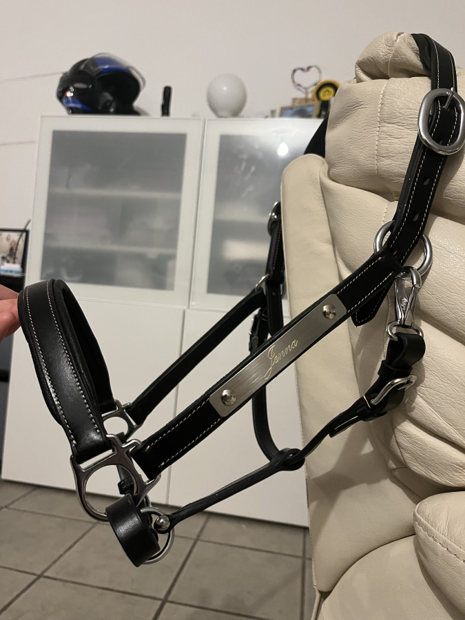 J’ai pris taille cheval car Jenna a une tête massive. Au pire il y a la place pour un trou supplémentaire de chaque côté de la têtière . Elle était tellement crado que je l’ai mis juste le temps de la photo
