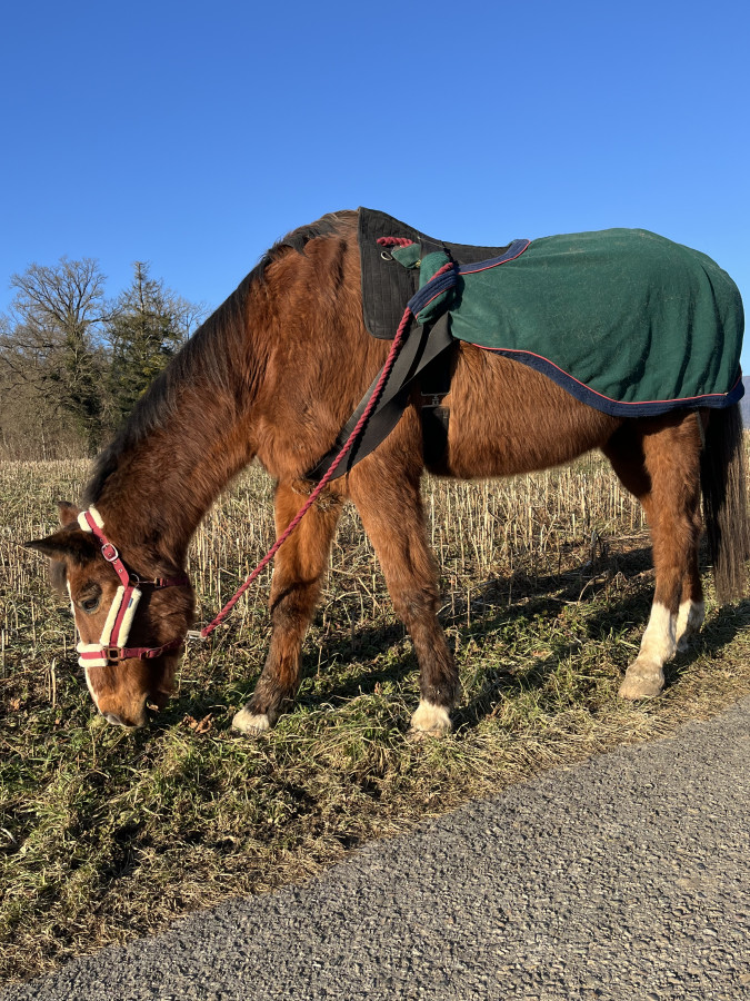 Et j’ai été « surprise », physiquement il est super !!!! Pour un cheval retraité et cushing, beau poil, dos de musclé mais pas défait. Il a eu des moments les deux dernières années où il était en moins bel état.