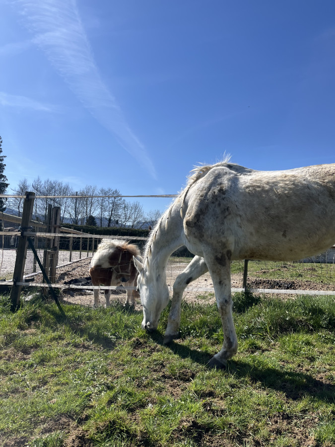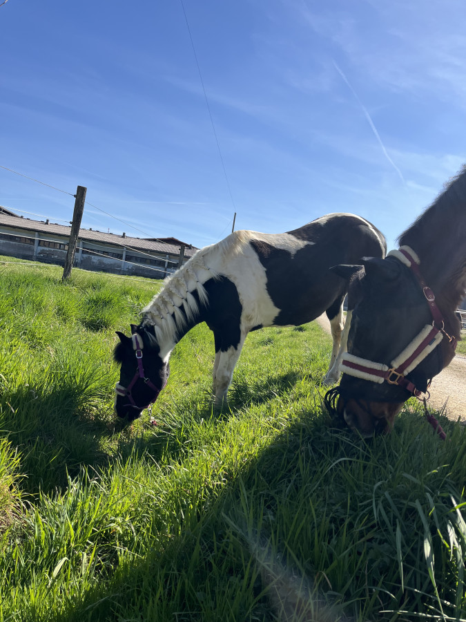 Après tout ça je l'ai laissé brouter dans le carré d'herbe pendant que je rangeait puis retour aux écuries, pose d'argile sur les membres, tresses puis retour dans le carré pour qu'il broute pendant que moi je dépoilais mes tapis back on track d'hiver donc 45 minutes de brouting puis douche pour enlever l'argile et retour au paddock