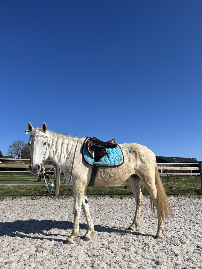 La selle j’ai réussi à l’avoir à un super prix d’occasion , la seule en 17,5 sur le marché ouf . Et j’ai également racheté sangle et arcade . Autant dire que mon porte monnaie est bien léger . Alors on aura toujours tendance à avoir une selle qui mange 1cm sur l’épaule mais on peux rien y faire ça sera le dernier compromis de selle possible pour ponette .