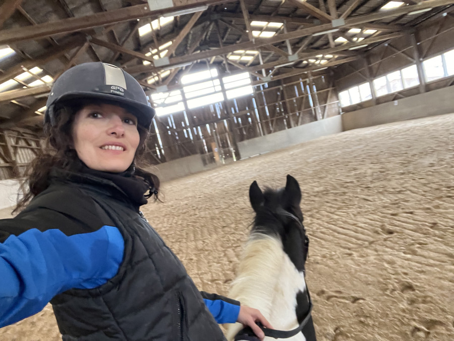 Sinon j’ai monté Jenna en carrière. Super progrès!!! Elle s’arrondit et se pose sur la main de plus en plus longtemps au trot. Elle va vraiment bien!!!