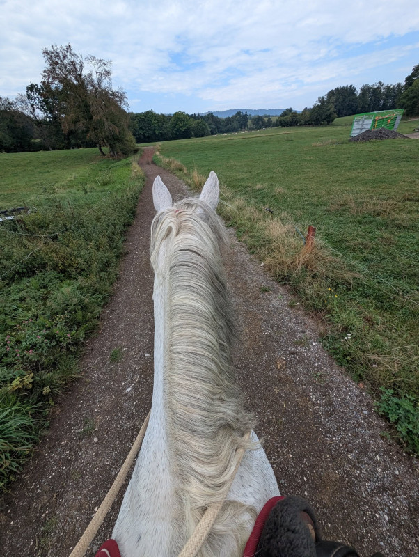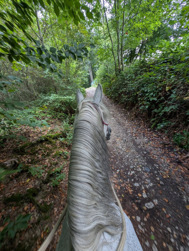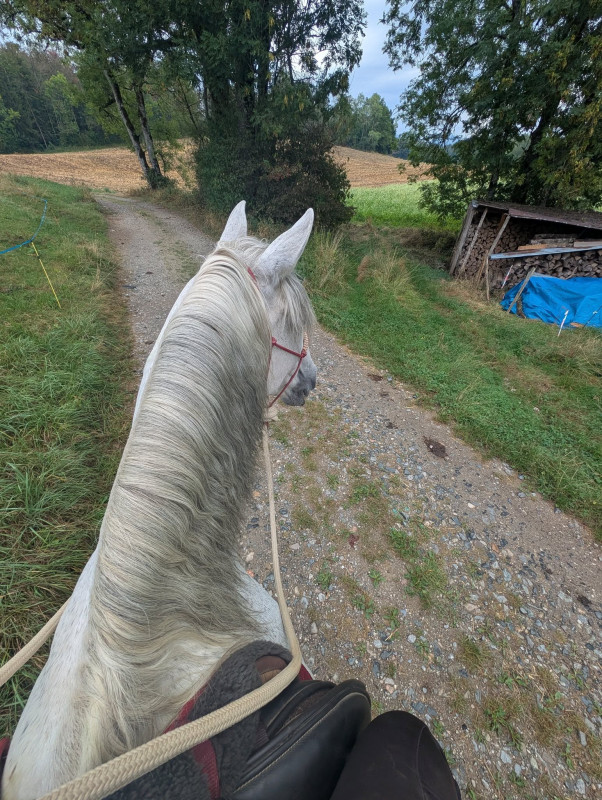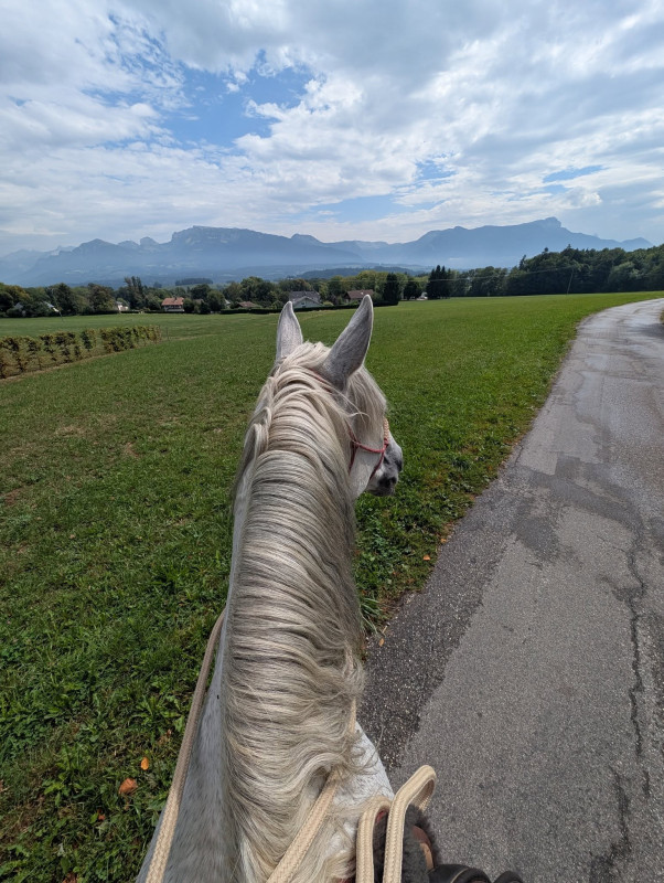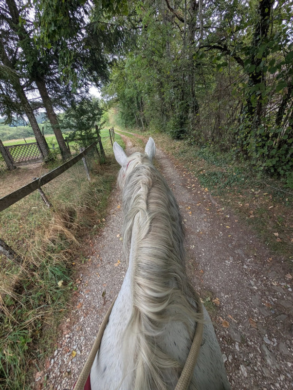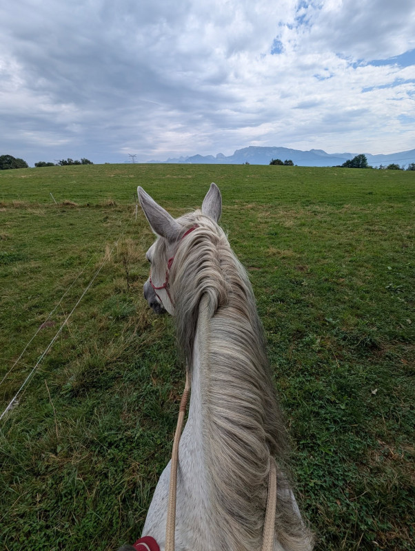 Sinon j'ai eu mon cours mardi soir c'était top. On a pas mal bossé sur la motivation de ponette, à en demander peu mais qu'elle nous le donne avec énergie et en se prenant en charge. On a travaillé principalement au pas et au trot à mobiliser les épaules pour débloquer son geste devant c'était vraiment très instructif.