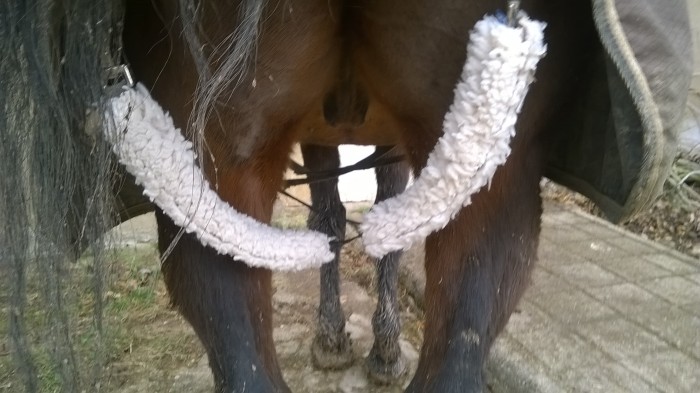 Bon j'ai mis tes fourreaux de muserolle sur les courroies de cuisse de la couverture à Kiwi, ça a l'air de vouloir rester à l'endroit où je les ai placées