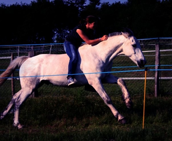 Du moins depuis que je l'ai au travail. Vendredi je suis remontée en selle d'obstacle, et longueur obstacle, au trot enlevé, je trouve directement ma place mais au galop en équilibre, faut que je desserre les genoux des quartiers (contrairement au dressage) pour éviter que mes genoux fassent amortisseurs et que je galope enlevé. Pour les Brejoires, finalement je n'y suis pas allée, la dame tient un discours très juste mais j'ai vu des vidéos d'elle a cheval et j'ai vite déchanté, ce n'est pas ce que je recherche. Je me suis toujours dit pareil : des hongres, et aujourd'hui encore, je pense que je m'orienterai plus facilement vers un hongre, mais en vivant qqch. de spécial avec une jument, je suis persuadée qu'on s'y attache plus fortement. Du coup, tu as quelle ponette ?