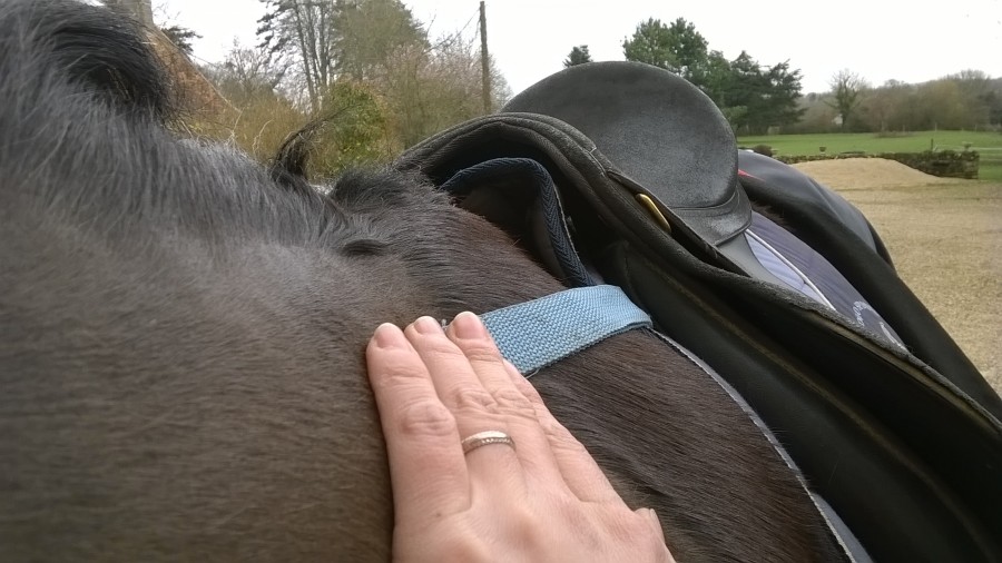 Donc on recommence, ça va mieux mais sans plus, je passe au trot, j'ai fait une vague épaule en dedans puis large cercle au trot enlevé en extension d'encolure, nickel! J'ai mis pieds à terre.