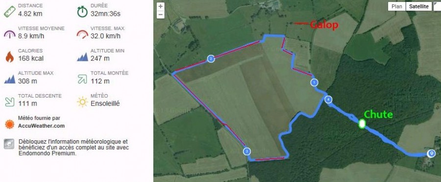 Dans la grande montée le long du champ, je l'ai laissé repasser au trot avant la fin car je sentais qu'il en bavait!! Ben oui y'a plus de gras à déplacer et ça fait longtemps qu'on ne travaille plus le cardio en extérieur.