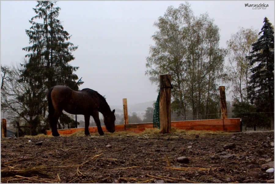 Là, il a juste une imperméable simple sur le dos (non tondu), donc je sais qu'il a eu un peu froid ces 2 dernières nuits, mais pas sûre car il a droit à du foin à volonté. Mais je sais qu'il apprécie d'être au sec et de pouvoir s'allonger au sec (il n'utilise pas l'abri, mais aime être dans un coin abrité du vent, mais "ouvert" du pré). Et je savais que les températures remonteraient dès aujourd'hui.