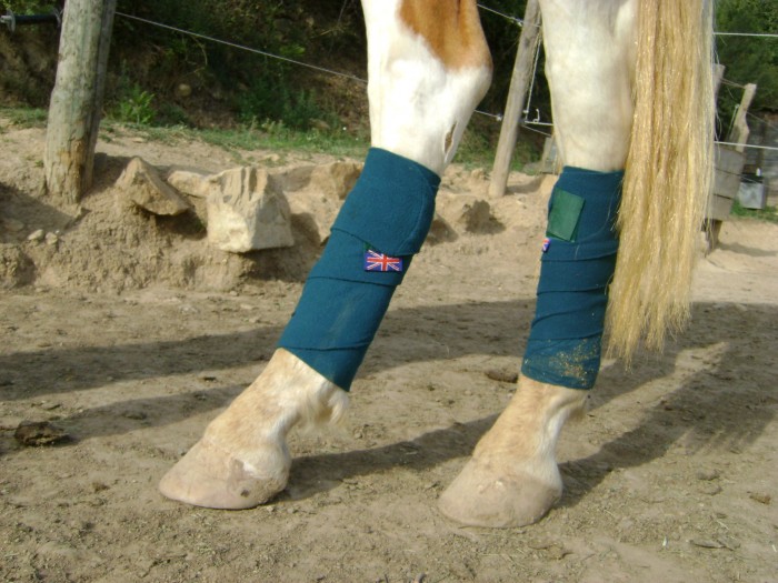 Il faut que du commence en haut du canon, aux deux-tiers de la hauteur environ. L'extrémité de la bande se pose bien à plat, sur la face externe du canon (pour bien pouvoir vérifier que tu ne feras pas de plis lors du premier tour), ni sur l'os si sur le tendon (pour ne pas créer de point de compression).