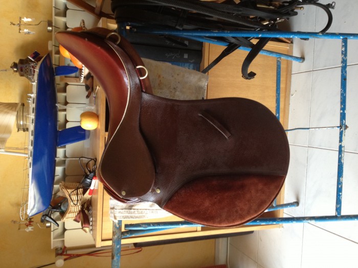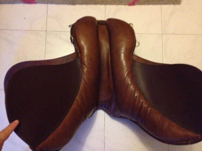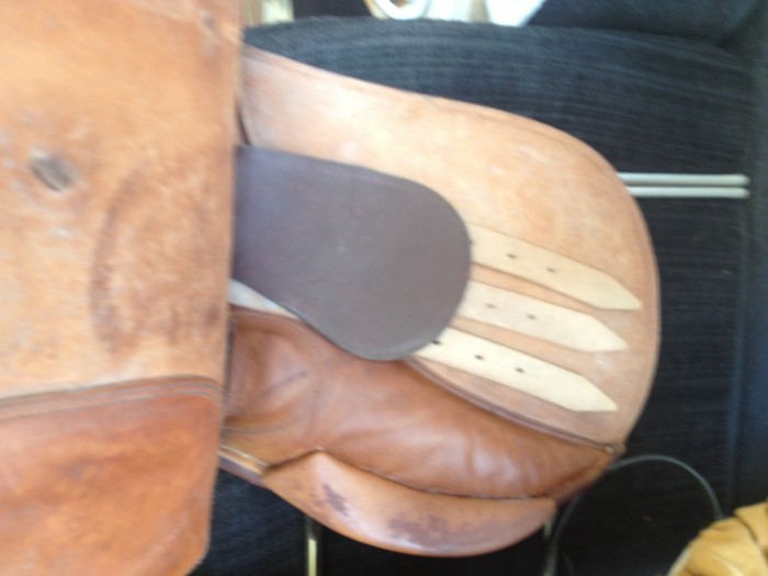 J'ai acheté ( il y a 1 ans ) une selle dans un vide-grenier ,le cuir etait très sec , il manque des sanglons (2) , et dessous il y a une matelassure avec je ne sais pas quoi , on dirais des poiles / du tissus ... (c'est pas le plus important )