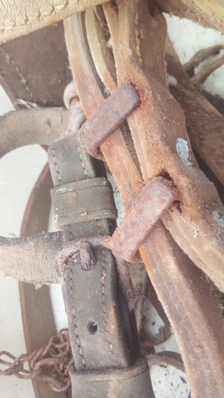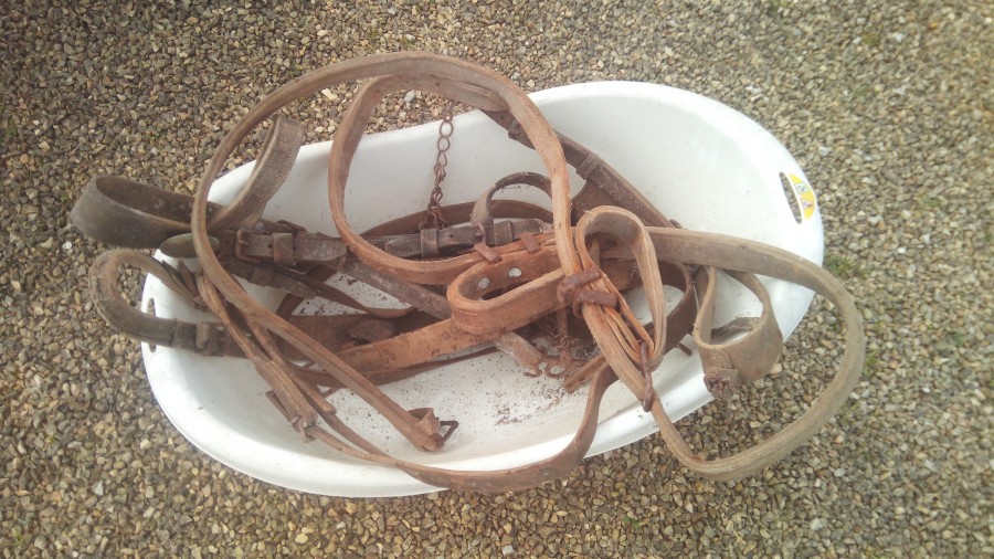 J'ai trouvé dans un grenier des vieux cuirs d'un harnais de trait, les cuirs sont entiers, le filet est complet. Fonctionnel je ne sais pas, mais j'aimerais en faire de la déco, pas m'en servir.