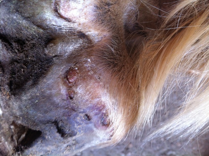 sinon ces blessures : j'arrive de temps en temps à enlever la croute, c'est la première fois depuis que j'ai le produit antibourgeon (que j'ai trouvé sur internet, commandé en pharmacie).