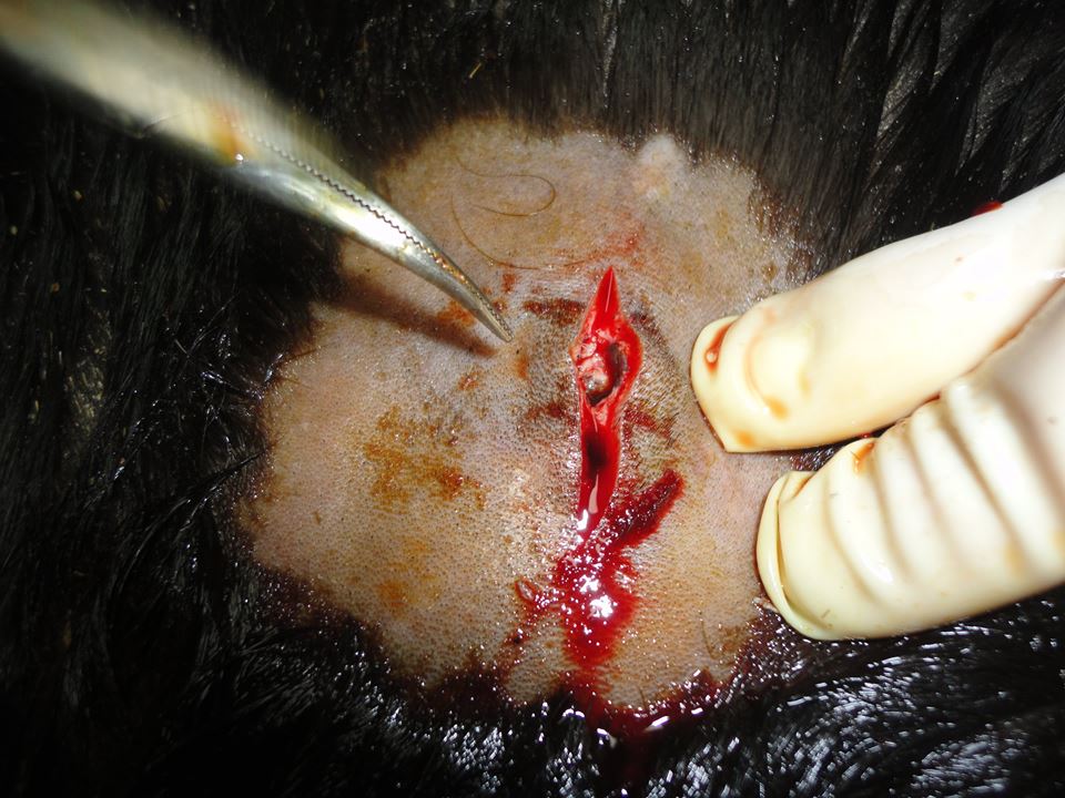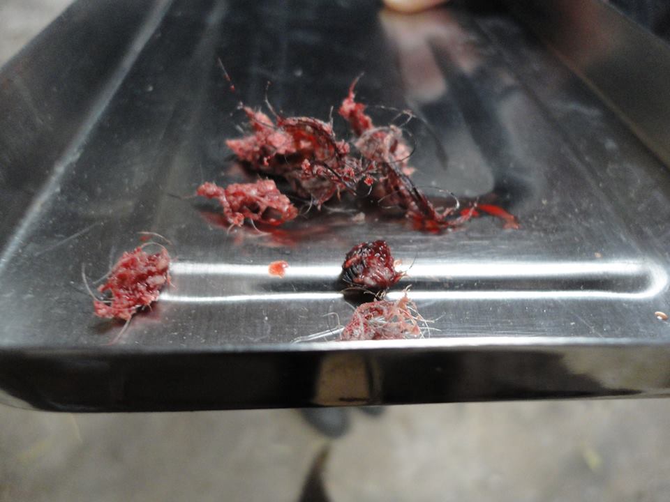 Aujourd'hui, donc, la vétérinaire est venue ôter ces deux kyste. Et quelle ne fut pas notre surprise de constater qu'il s'agissait, en réalité... de POILS !