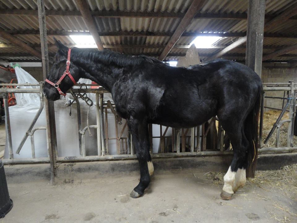 Coup d'coeur est un SF très robuste avec beaucoup d'os ! Il a de grosses articulations et des canons courts. Il n'est pas très grand pour le moment (1m60) et le maréchal m'a dit qu'il ne sera pas très grand (pas au delà d'1m65). Il parait petit car il a un gros bidon, et le printemps arrive alors ça ne va pas s'arranger ! |