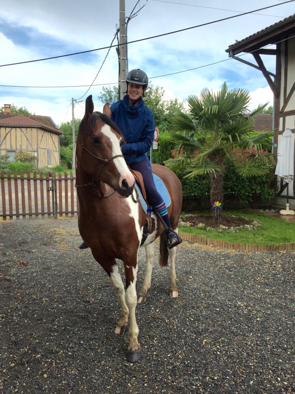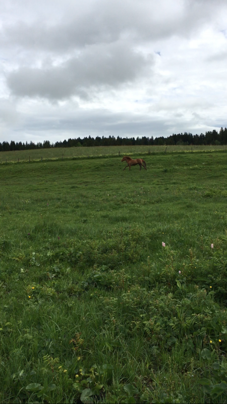 Et enfin, je suis montée dessus pour les 3 derniers km, j'avais l'arrêt, la marche avant. J'ai même trotté un petit peu. Passage de vaches sans problème, elle a juste hésité à un moment pour je ne sais pas trop quoi, j'ai fini par descendre en la sentant vraiment stresser, mais je ne sais pas ce qui lui a fait peur, puis je suis remontée un peu plus loin (mention spéciale pour la 4 ans qui démarre au pas avec le cavalier à moitié sur son dos, qui s'arrête à la demande sans se poser de question alors que la jambe est agrippée à sa croupe...), elle a un peu stressé pour un combo panneau + sac poubelle, a trottiné et a tenté de voir si c'était pas négociable le pas (et moi qui n'osais pas trop m'assoir car j'avais mon sac à dos et donc j'avais peur que ça lui chatouille le dos), puis parfaite jusqu'au champ, on a croisé une voiture pas de soucis. Un bonheur cette pouliche, et 0 réactions aux claques pour éclater les taons sur la croupe ou les flancs.