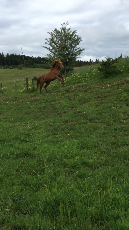 On a été dans la forêt, je grimpe dessus sur un coup de tête, Cajo fait 2pas puis pile car il y avait un tas de bois, elle tente le demi tour, le reculé, j'encourage, elle fini par faire 2 pas, je descend et on passe devant en la laissant regarder, je percute à ce moment là qu'on a jamais fait ce chemin... Tant pis, je remonte un peu plus loin, puis je m'éjecte illico sur un demi tour car je me rend compte que ma bombe et autour de mon bras et que j'ai mal attachée les rênes donc c'était potentiellement dangereux