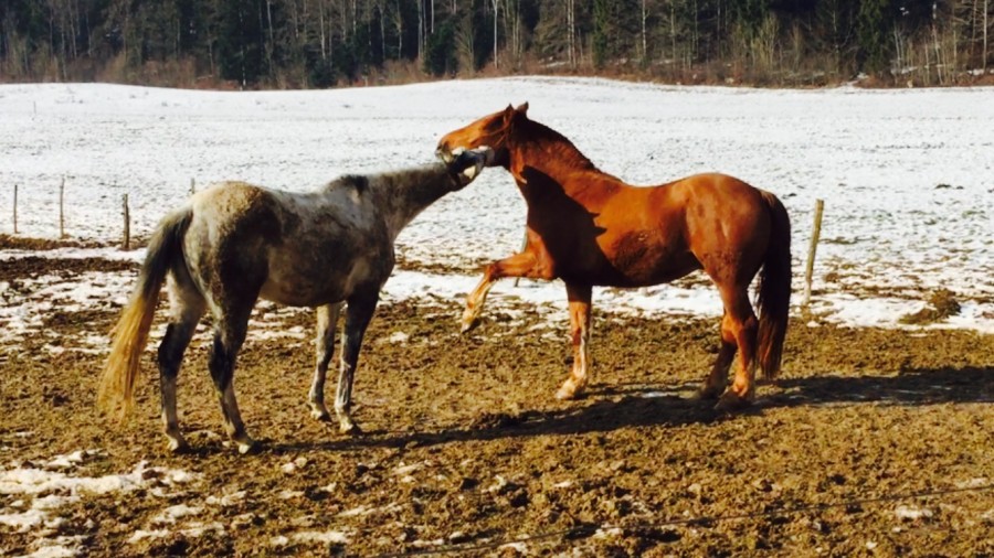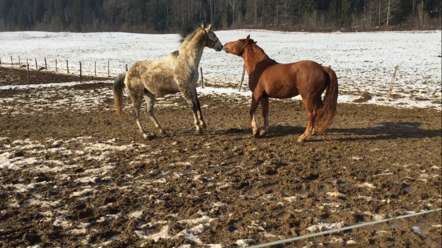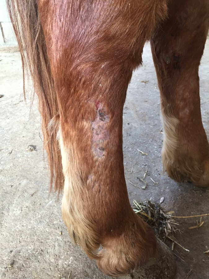 Mardi il m'a déclaré une énorme gale de boue , rien au boulet ni au paturon mais tout au dessus ! Sur les 2 postérieurs ! Je l'ai retrouvé avec 2 gros poteaux et presque raide boiteux !