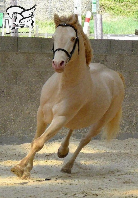Vertige de Pagellerie, premier étalon Connemara perlino accepté en classe 1 homozygote sur le crème, pas de gêne gris