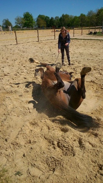 13/04 En carrière, concentration un peu dur avec les copains, variations d'amplitude du trot pas mal mais moins bien que d'habitude. Des transitions, arrêts, reculer bien, et surtout au pas incurvation et direction sans les mains, parfait. Par contre galop de fou, rapide, couché, pas dans le calme. Donc à retravailler.