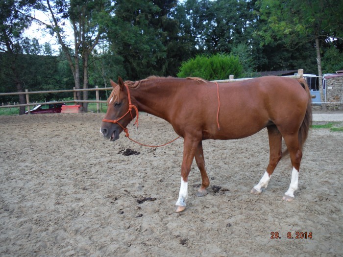 Jeune jument mais super sympa, bossée depuis 1 ans en complet. De bonnes bases, volontaire, hyper facile en main. Nécessite cependant un cavalier ferme pour ne pas qu'elle le trimbale. (jamais un coup de cul ou quoi, mais elle va arracher les rênes ou ne pas avancer si elle sent que le cavalier n'est pas présent)
