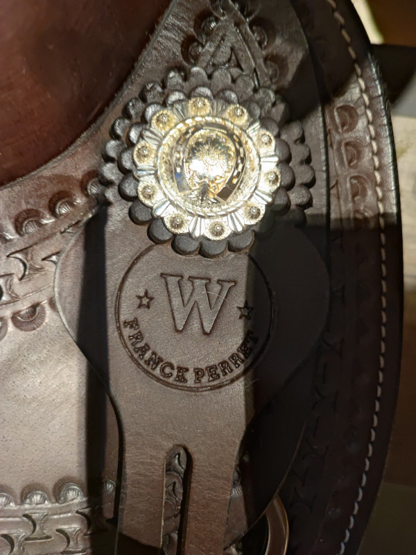 Sur une selle western le cuir est souvent travaillé : le côté de grain (dessus) peut être timbré et/ou sculpté (le côté du dessous s'appelle la chair). Il vous faut donc bien regardé les motifs mais aussi la qualité de la bouclerie : Les motifs ont-ils été fait à la presse industrielle ou ont-ils été marqués ou gravés ? Quel est le métal utilisé pour la fabrication des boucleries et autres décorations ?