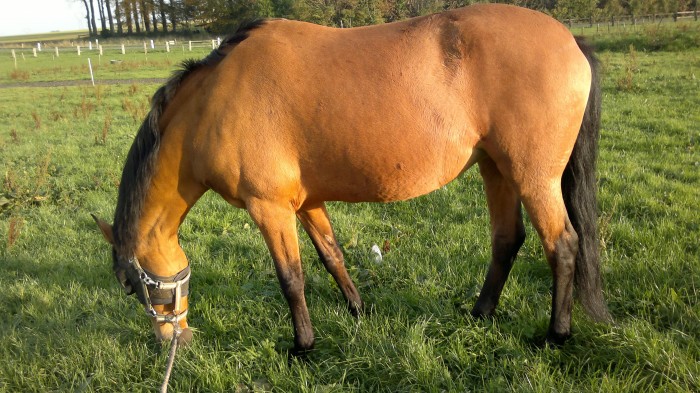Julietta , ONC , 1M , noir ( balzane haute + petite marque blanche haut de l'épaule ) X Pirate , ONC , 1m , gris = Présumée pleine = mise bas prévu 28/05/2014 pour un poulain ONC.