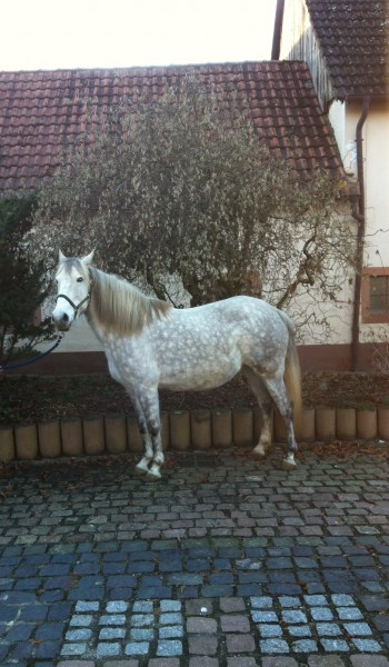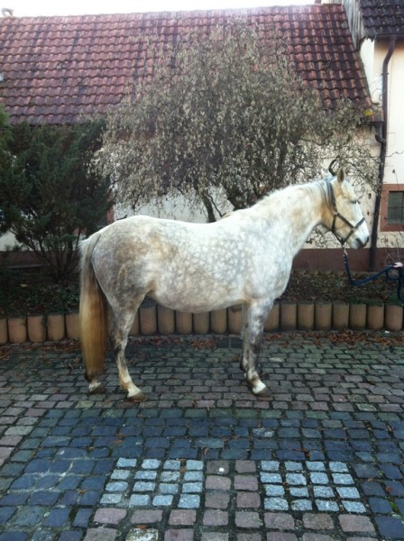 Julietta , ONC , 1M , noir ( balzane haute + petite marque blanche haut de l'épaule ) X Pirate , ONC , 1m , gris = Présumée pleine = mise bas prévu 28/05/2014 pour un poulain ONC.