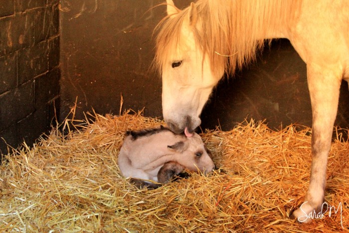Naissance d'une belle pouliche baie brune avec une balzane, par Nonplusultra et Carétina. Tout s'est très bien passé, et tout le monde va bien.