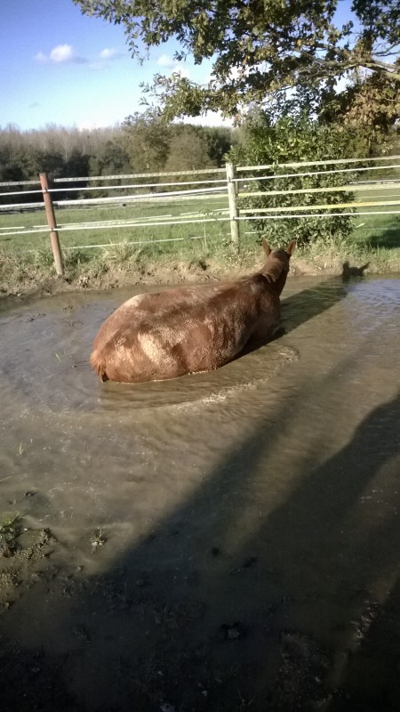 Et puis le temps passe, je me rends compte qu'il est dominant avec moi, pas fou furieux mais montre ses fesses si je l'embête... donc ni une ni deux, travail étho, exercices Parelli, balançage de brosse sur la croupe quand il tourne ses fesses vers moi, bref pas le nirvana. Ben au bout de quelques semaines comme ça loulou a compris qui est le "leader", et est même devenu câlin, lui que je n'intéressais absolument pas (à part pour manger...gros gros gourmand) me collait maintenant, au pré, restait sans bouger à côté de moi, lui si brutasse est devenu d'une telle douceur que je l'ai rebaptisé Velours (en + je hais les prénoms humains pour les chevaux !!!), et le jour où il a découvert que je pouvais lui gratter l'intérieur des oreilles, je crois que je suis devenue sa meilleure amie !!!