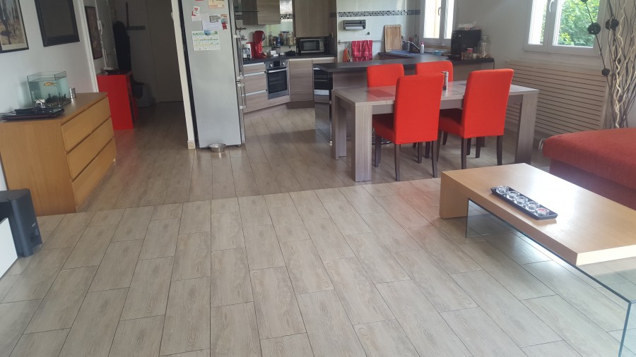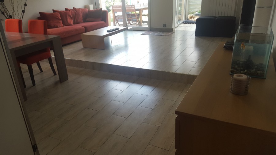 Voilà mon espace salon avec la fameuse marche qui me fait flipper. Il y a une autre marche au niveau de la véranda mais bien plus petite, elle doit faire le tiers de celle qui sépare le salon en 2.