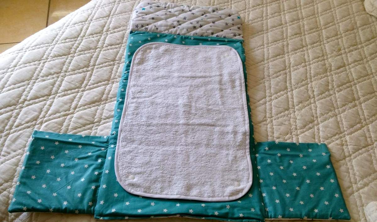Et j'ai aussi pris avec ma mère les tissus pour un tapis à langer nomade qui sera donc dans les bleu canard ! Ca ressemble à ça la forme, en coton enduit imperméable sur le dessous, et donc ça se roule et c'est super pratique pour éviter de tacher le canapé des copains