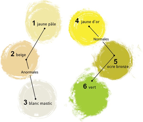Pour les selles c'est normal que ce soit liquide ;) Niveau couleur je te mets une photo :