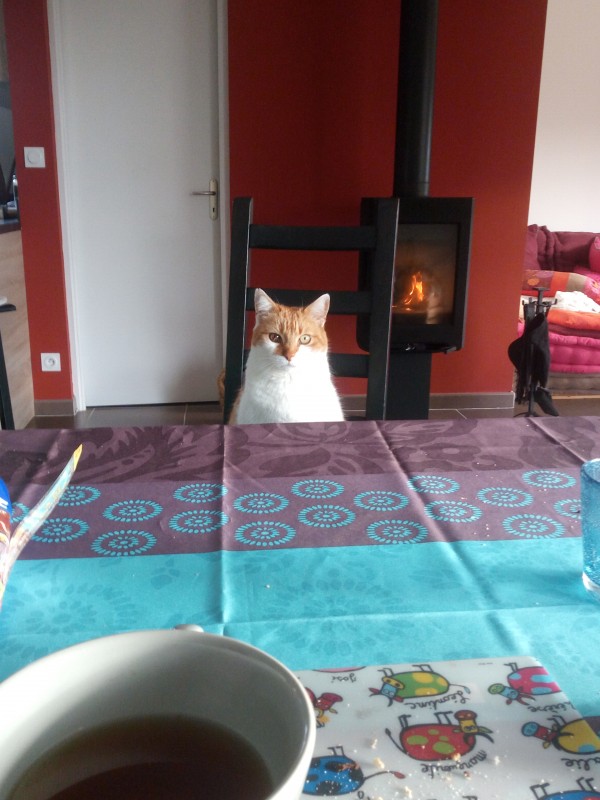 il petit déjeune avec moi aussi!(photo de cet hiver mais il le fait souvent)
