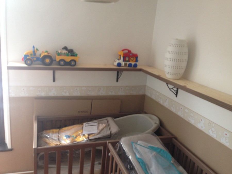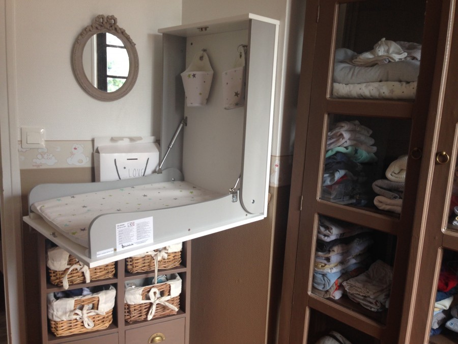 il manque de la déco, je pense que le poster Némo va partir et il y aura un autre tableau genre avec des ourson. Le poster c'est pour cacher la misère, la table a langer devait être a cette place mais le mur s'est écroulé.