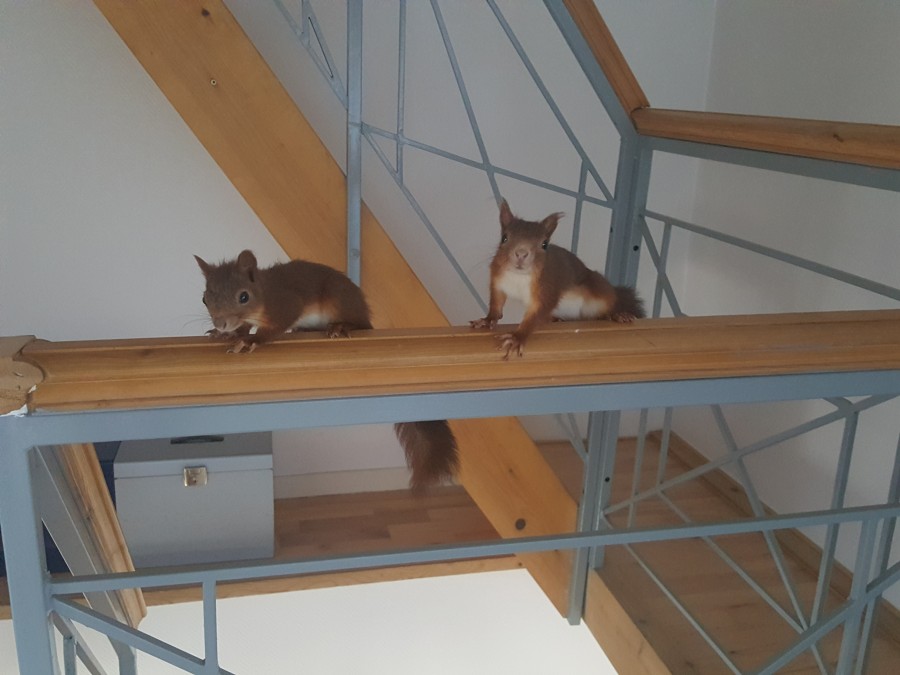 Oui oui nous avions deux écureuils depuis septembre l'année derniere. C'est un sauvetage de chéri, élagueur de profession. Ils avaient abattu un arbre sans voir un nid malgré les vérifications habituelles. Du coup ayant retrouvé la maman morte, il avait ramené les deux petits à la maison. Ils avaient quelques semaines obligé de biberonner et bien-sûr chéri c'était barré 15 jours en déplacement professionnel donc j'ai été leur maman de substitution.