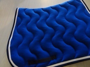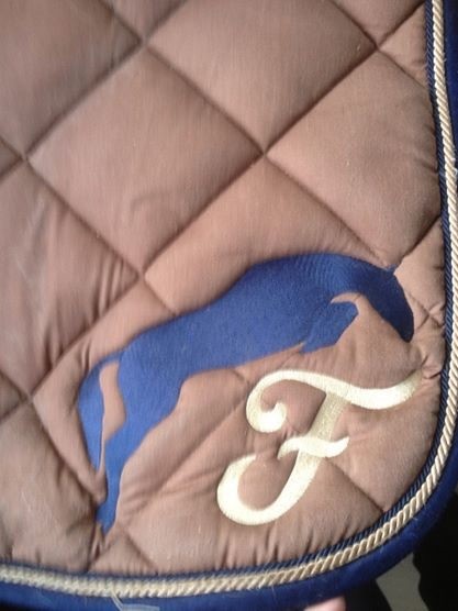 Sur mon ancien tapis de concours (avant le bleu roi) j'avais créer un logo avec un cheval qui saute et la lettre "F" comme Farceuse ma jument.