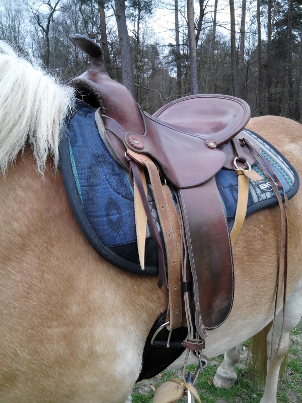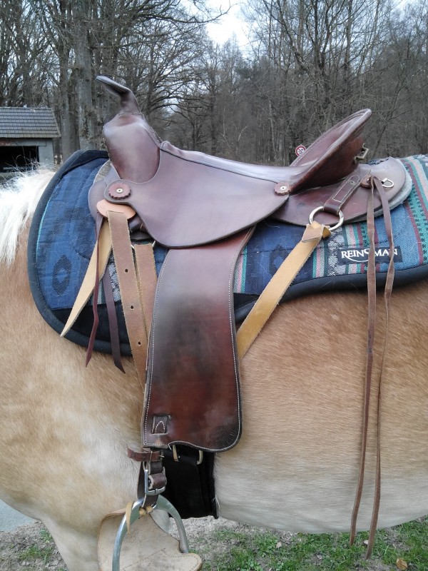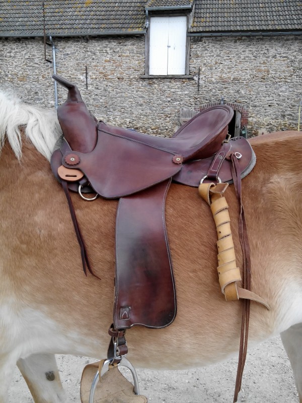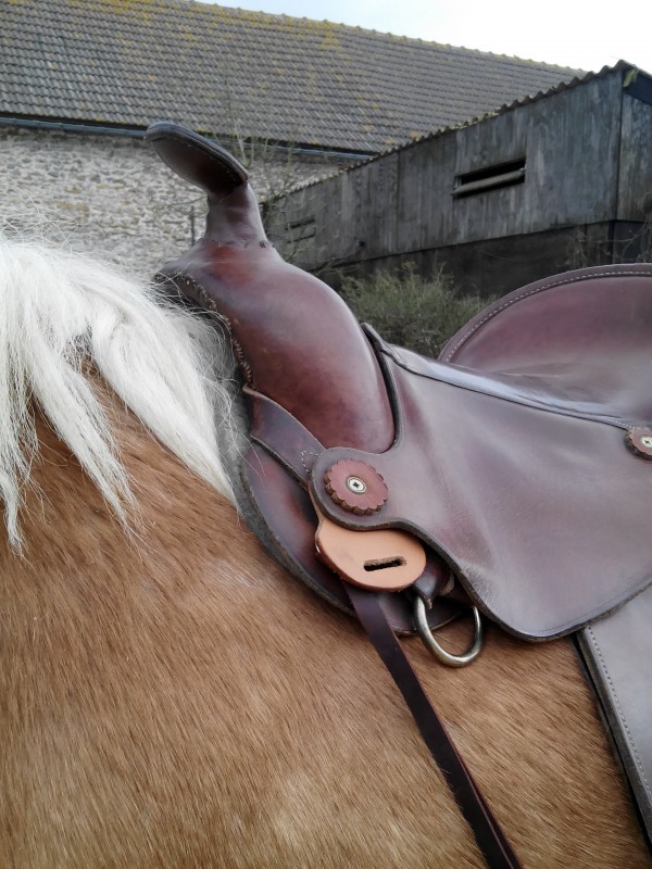 l'avantage de cette selle, c'est qu'elle s'attache en trois points et donc le sanglage est bien reparti et la selle bien maintenu devant et derrière