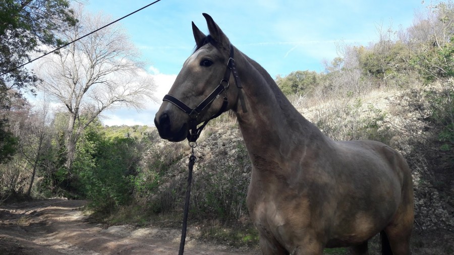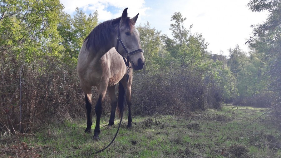 Et quand il dit non, c'est non. Il invente tout et n'importe quoi pour se soustraire à ce qu'on lui demande, il fait le crabe, il courre, il fait la girafe, il se ratatine tellement qu'il me reste 1/3 de la longueur de rênes que je devrais avoir, il a le dos par terre et il trotte comme un lapin à roulette. Comme il sait très bien que je suis pas hyper gainée et que si il tire je plonge, il secoue la tête autant qu'il peut...