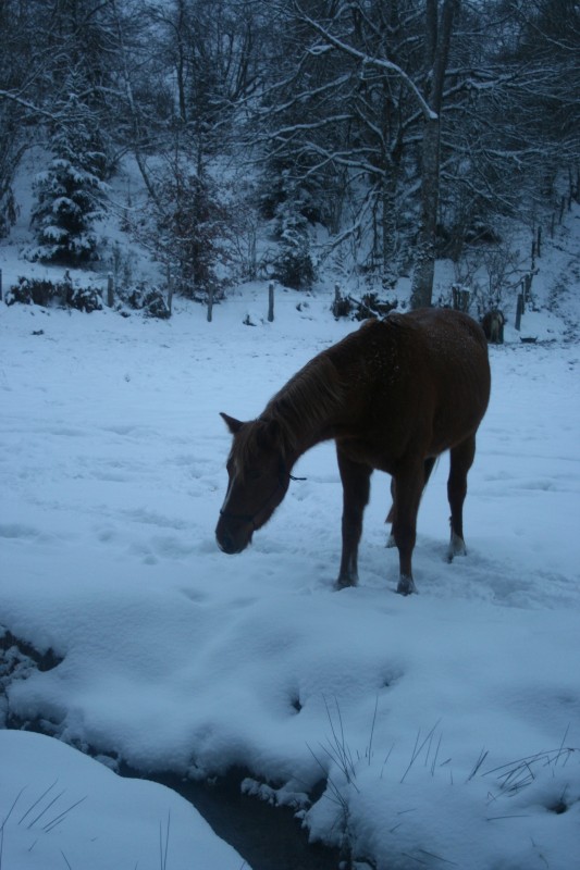 Pour l'eau c'est le ruisseau , esperons que ça ne posera pas de problème. A savoir que si ça ne conviens pas , je peux changer de mode de pension à tout moment , ça c'est un gros plus . De toute faàon au vue de l'urgence de la situation et vu ce qu'il y a vers chez moi , je n'ai pas bien le choix donc je l'appelle ce matin pour voir quand il viens me la chercher , la neige viens de se pointer ( pas beaucoup ) mais assez pour empêcher un transport ...